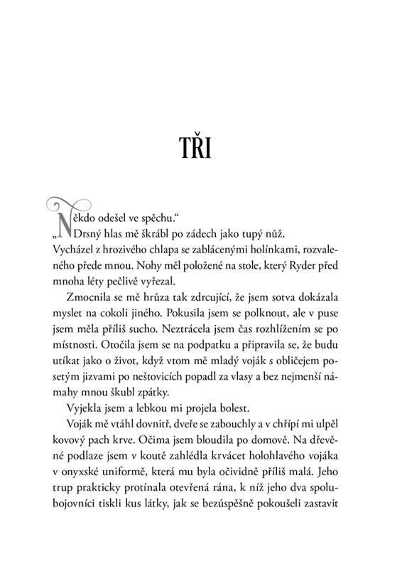 Arwen Valondaleová by nikdy neřekla, že bude natolik statečná, aby nabídla svůj život za ten bratrův. Jenže přesně to je důvod, proč je teď zajatkyní obávaného Onyxského krále, jehož vojáky má pomocí svých magických schopností uzdravovat. Jedinou cestou ke svobodě je spolupráce s prohnaným spoluvězněm, kterému však dělá zvrácené potěšení hrát si s jejími nejhlubšími obavami. I bez jeho upozorňování totiž ví, že ten, kdoho snad kdysi milovala, je už nejspíš mrtvý. Co když jsou však tajemství Onyxu daleko děsivější, než si je dokázala představit?
