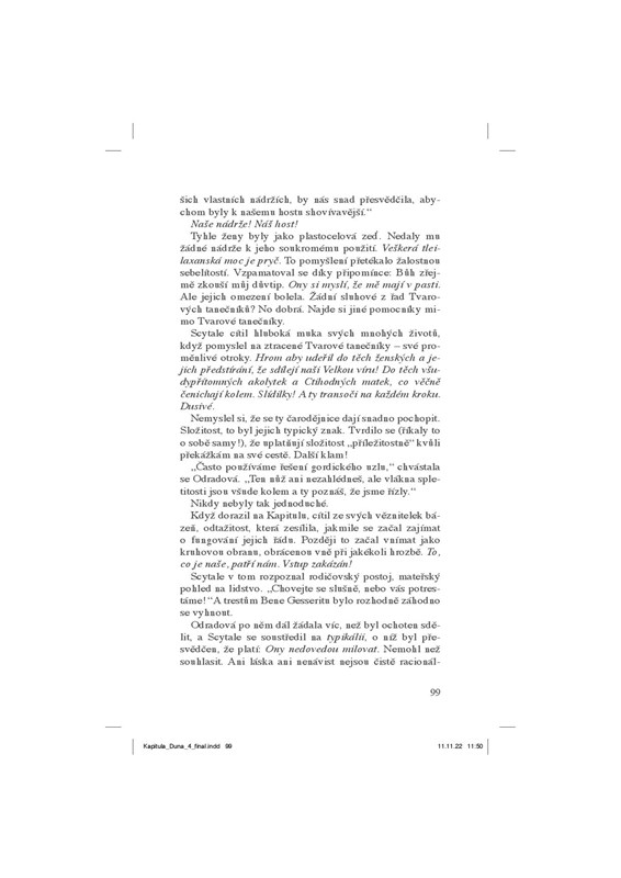 Pouštní planeta Arrakis neboli Duna byla zničena atomovým útokem Ctěných matre. Jen jedna frakce lidstva může ohrozit moc tohoto lítého matriarchálního kultu, a to Bene Gesserit, vybavený dědictvím Duny. Pod vedením Matky představené Darwi Odradové kolonizuje Bene Gesserit úrodnou planetu Kapitula a vytrvale, míli za mílí ji proměňuje v poušť. Pokud Sesterstvo uspěje s chovem písečných červů, ovládne produkci nejvýznamnější komodity v celém vesmíru, koření zvaného melanž. Ale jeho skutečnou zbraní zůstává muž, který prožil nesčetné životy – muž, který sloužil legendárnímu Paulu Muad’Dibovi…