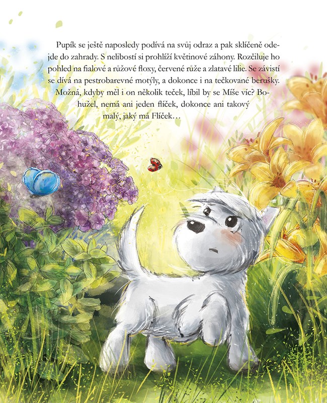 Jednoho dne Míša začne obdivovat barevné ptáky a Pupík si připadá takový málo barevný. Kromě touhy po barvách na pejska čekají i velká dobrodružství, třeba návštěva opravdového výstavního psa a dokonce výlet na jarmark!