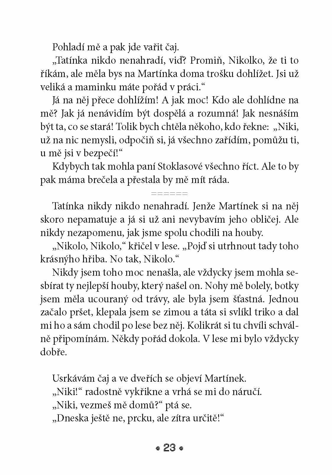 Nikola to doma nemá jednoduché. Táta je po smrti a s máminým přítelem Zdeňkem zrovna nevycházejí. Ještě že má mladšího brášku Martina, který ji má rád a se kterým si báječně rozumí. A taky paní Stoklasovou, která Martínka občas pohlídá, aby mohla Nikola do školy, kam už takhle moc nechodí. Jednou ale paní Stoklasová dostane infarkt. Martínek je zrovna u ní, zavolá jí záchranku a zachrání jí život. Paní Stoklasová mu za to chce splnit jedno přání - a Martínek si přeje, aby mohla Nikola jet na lyžák, na který maminka nemá peníze. Všechno vypadá dobře, dokonce i spolužák Sáďa je čím dál zajímavější. Jenže když se Nikola vrátí domů, věci naberou nepěkný spád...