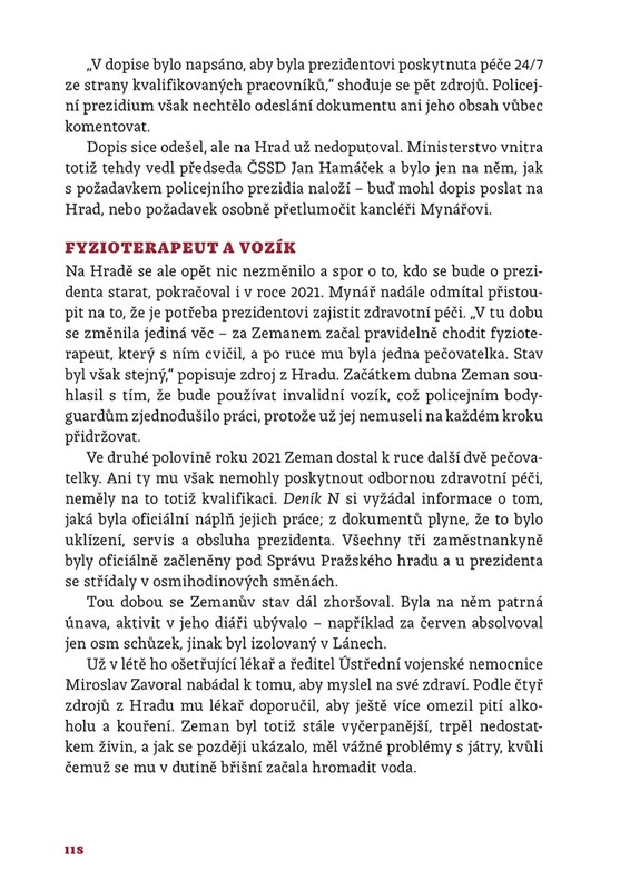 Investigativní novinářka Zdislava Pokorná se dění na Pražském hradě během této éry věnovala s mimořádným nasazením, za které dostala Novinářskou cenu. Zjistila řadu nových informací, a to prostřednictvím rozhovorů s desítkami zasvěcených lidí a také díky stovkám hodin strávených přímo na nádvoří Pražského hradu, kde sledovala, s kým se Zemanovi muži stýkají. Krom toho kniha přináší také první podrobný životopis Martina Nejedlého, jehož působení v Rusku bylo dosud zahaleno mlhou. Popisuje, jak Vratislav Mynář vydělal první miliony a jak rostla jeho mocenská pozice. Odhaluje, jak se vyvíjel Zemanův vztah s oběma premiéry z posledních let –? s Andrejem Babišem a Petrem Fialou. A shrnuje, jak se postupně zhoršoval prezidentův zdravotní stav, zatímco jeho nejbližší okolí to odmítalo řešit.