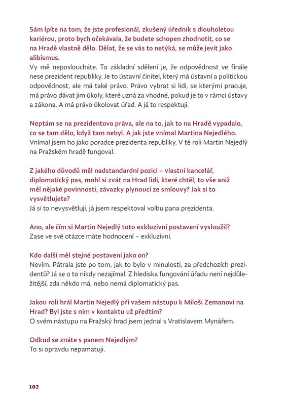 Knihu doplňují rozhovory s přímými aktéry událostí –? s bývalým premiérem Vladimírem Špidlou, ministrem spravedlnosti Pavlem Blažkem, který býval na Hradě častým hostem, s vlivným úředníkem Janem Novákem či novou kancléřkou Janou Vohralíkovou.