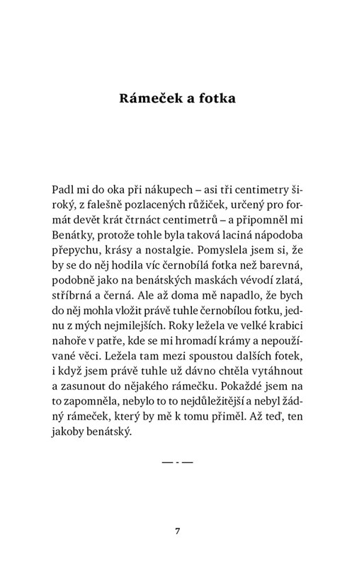 Jaká jsi byla? Co bylo na začátku? Po čem jsi toužila? Pohled na rodinnou fotografii z dětství spustí nezadržitelný proud intenzivních vzpomínek. Ivana Peroutková očko po očku splétá intimní biografii jedné neobyčejně obyčejné ženy. Jak bude vypadat konečný vzor jejího života? Do výsledku promluví neúnavná touha, osudové vztahy, rodinná minulost, hledání sebe sama i vášnivý požitek ze čtení.