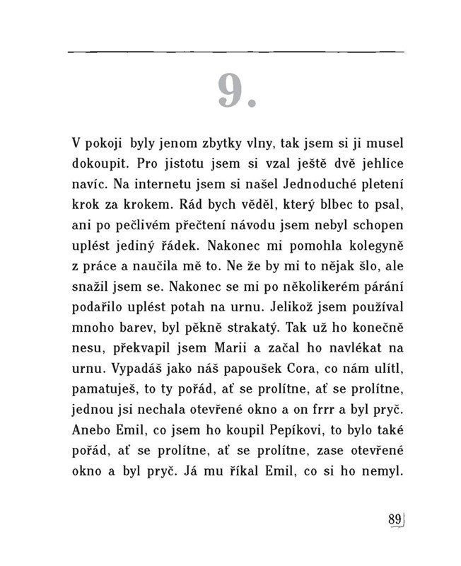 Literární debut známého brněnského herce Jana Grygara vychází z jeho tragikomického monodramatu, s úspěchem uvedeného na prknech Mahenova divadla. Nejedná se o autobiografii, i když v ní je hodně příběhů ze života autora i jeho kamarádů. Je to tragikomedie o tom, že si kolikrát neceníme toho, co máme, a uvědomíme si to až ve chvíli, kdy o to přijdeme.