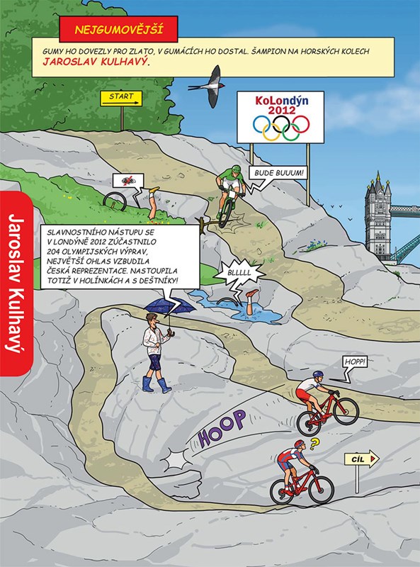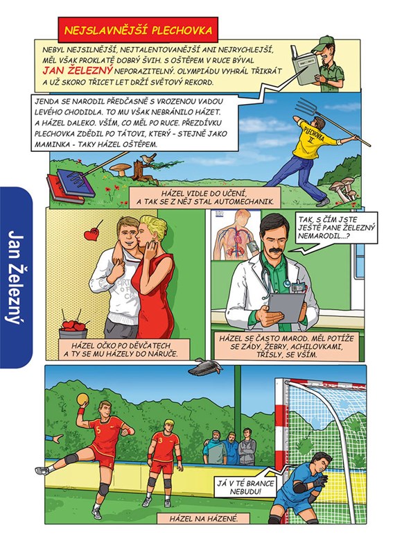 Víte, kdo pro Československo získal první zlatou medaili na olympiádě? V dávném roce 1924 to byl vyučený řezník, který šplhal po laně. Dokážete si vybavit, kteří obojživelníci žijí v přírodě kromě zimní královny Ester Ledecké? Proč Češi dokážou tak obratně mrskat oštěpem nebo pádlovat v divokých peřejích? Možná se budete divit, ale všechny odpovědi se dají nakreslit. Proto vznikl originální komiks 33 olympijských nej.