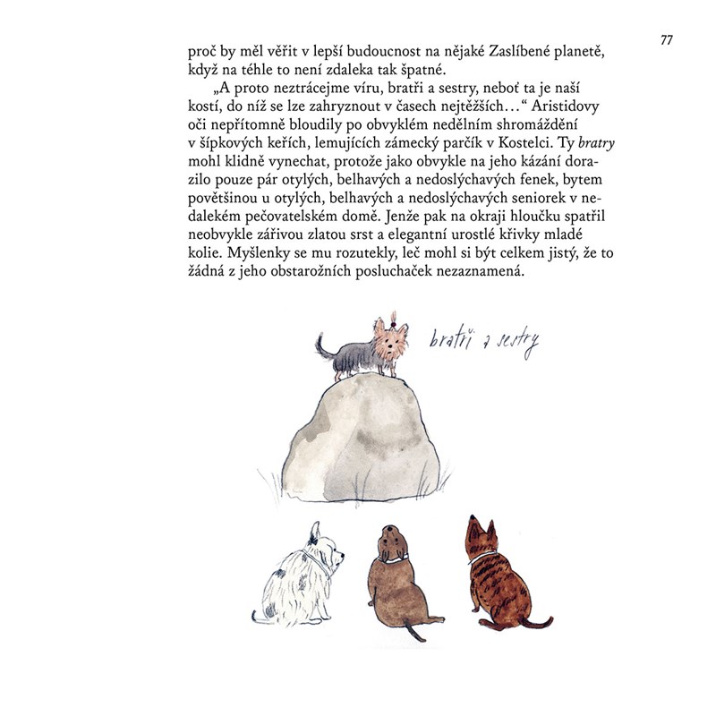 Červencová vedra dopadla na Kostelec plnou vahou a šesťačku Rebeku Voříškovou, jejímž tělesným proporcím i rodinným poměrům rozhodně není co závidět, čeká jen další smutná schovávačka před vrstevníky na domácí zahradě. Osamělá zakomplexovaná holka z městečka pyšnícího se leda tím, že leží v úředně uznaném pupku republiky, však ještě netuší, že tyhle prázdniny budou i pro ni čarovné. Kostelcem začala šmejdit černá kočka s uhrančivýma očima a vybudila k akci elitu místních psů, kteří tu – světe, div se – přežívají v partyzánském maskování za domácí mazlíčky, protože ve zdejším kraji před pár tisíciletími havarovali při vesmírné pouti na Zaslíbenou planetu. Pokud jim ale Rebeka pomůže opatřit vzácnou slitinu z laboratoře bláznivého pražského profesora, bez níž jejich raketa neodstartuje, je šance na nalezení psího ráje znovu reálná.