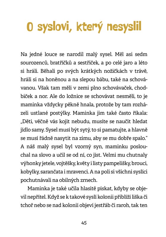 Pohádky o Býkovi a kobyle, Nedoslýchavém králi, O syslovi, který nesyslil, a další příběhy s vyšším výskytem vyjmenovaných slov jistě pobaví děti mladšího školního věku. Možná při jejich čtení a plnění jednoduchých zábavných úkolů dokonce zapomenou na to, že si právě procvičují vyjmenovaná slova. Čtenáři ocení také pěkné ilustrace, které dokreslují příběh a jsou nápovědou při řešení doplňovaček.