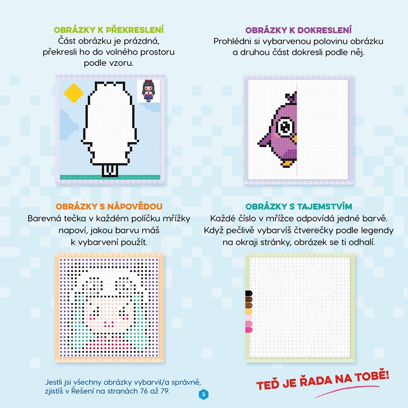 Do prázdných mřížek můžeš překreslovat obrázky podle vzoru, dokončovat neúplné kresby nebo vybarvovat tajemné ilustrace. Tak rychle pro tužky a pastelky!