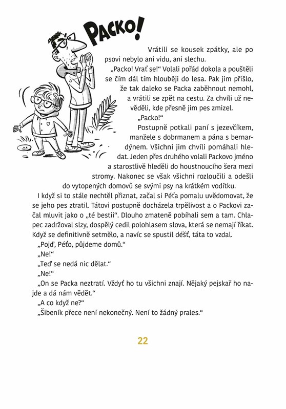 Šestiletý Péťa to má vážně těžké – nikdo ho nebere vážně. Nosí brýle, je trochu oplácaný a jeho spolužáci mu to při každé příležitosti připomínají. Když se chlapec jednoho dne ztratí, celé město je na nohou! Péťa pátrá v hlubokém lese po svém psovi jménem Packa a prokáže při tom odvahu, jakou by mu záviděl leckterý puberťák. Ještě štěstí, že mu kryje záda jeho kamarád Betmen.