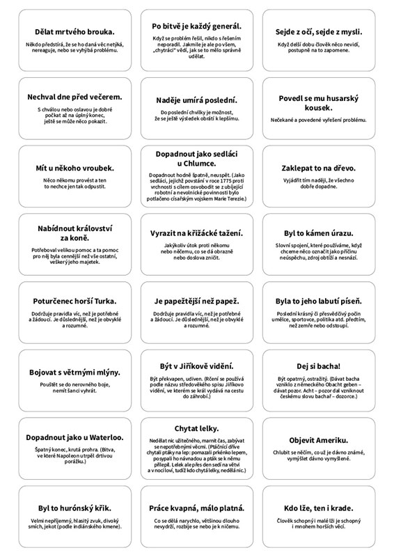 288 kartiček s vysvětlením jejich významu a 24 návodů na hry, které s nimi můžete hrát, budou nejen zábavné, ale i přínosné. Využít je mohou žáci ZŠ, kteří se připravují na jednotné přijímací zkoušky z češtiny, učitelé, logopedi nebo pracovníci v zájmových kroužcích a domovech pro seniory.