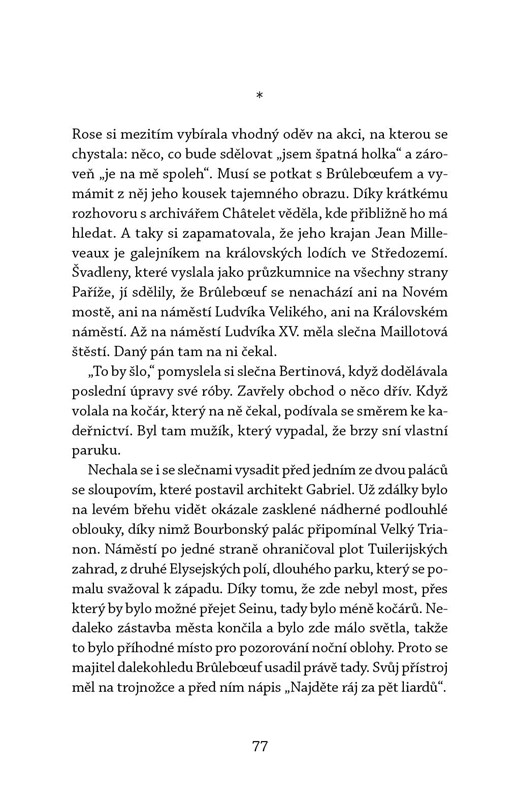 Marie Antoinetta, která právě nastoupila na trůn, se trochu na svém královském křesle nudí, a proto v tomto případu vidí příležitost uplatnit svůj vyšetřovací talent. Pověří dva amatérské detektivy: Rose Bertinovou, svoji krejčovou, a extravagantního kadeřníka Léonarda Autiera, aby vyšetřili případ ukradených šperků hraběnky du Barry, milenky bývalého krále Ludvíka XV. Ti dva si však rozumějí jako kočka a pes! Pokud si však chtějí udržet královninu přízeň, budou se muset navzájem snášet. Podaří se jim najít kořist, jak si Její Veličenstvo přeje? S francouzskou lehkostí a humorem napsaná detektivka slibuje kormě vyšetřování i zajímavé historické detaily z doby vlády Marie Antoinetty na francouzském trůnu.