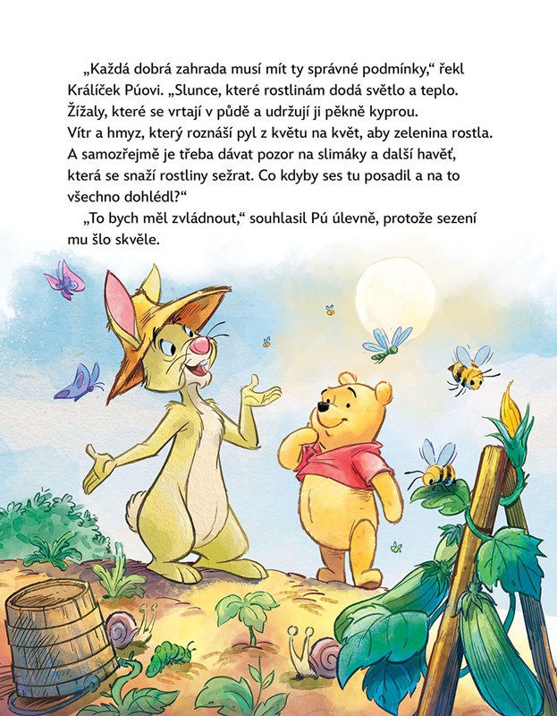 Máte v ruce další knížku s novými příhodami Medvídka Pú a jeho kamarádů Kryštůfka Robina, Prasátka, Ijáčka, Tygra, Králíčka, Klokánka a paní Sovy. V prvním příběhu si přečtete, jak Pú pomáhal Králíčkovi na zahradě. Trvalo dlouho, než se zjistilo, která činnost jde Púovi nejlépe! V druhém se dozvíte, jak to ve Stokorcovém lese vypadá, když začne padat první sníh. A poslední vyprávění je o tom, jak Pú pozoroval hvězdy na noční obloze. A třeba si přitom můžete i něco přát!