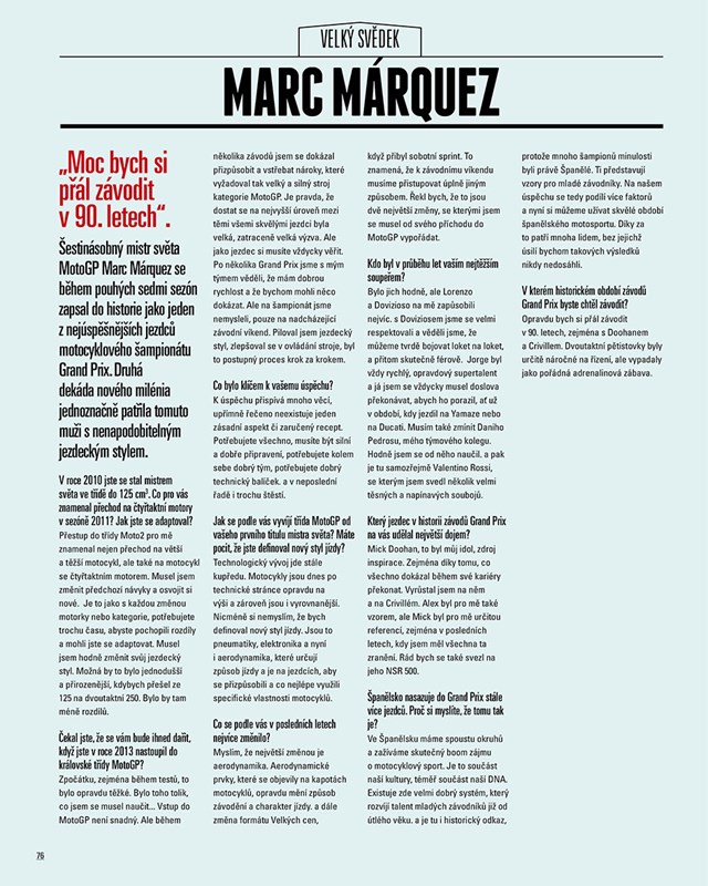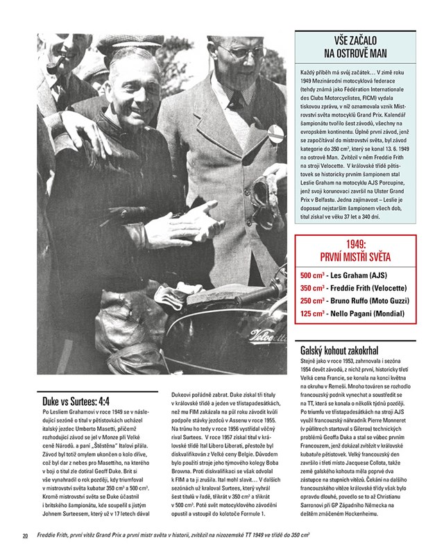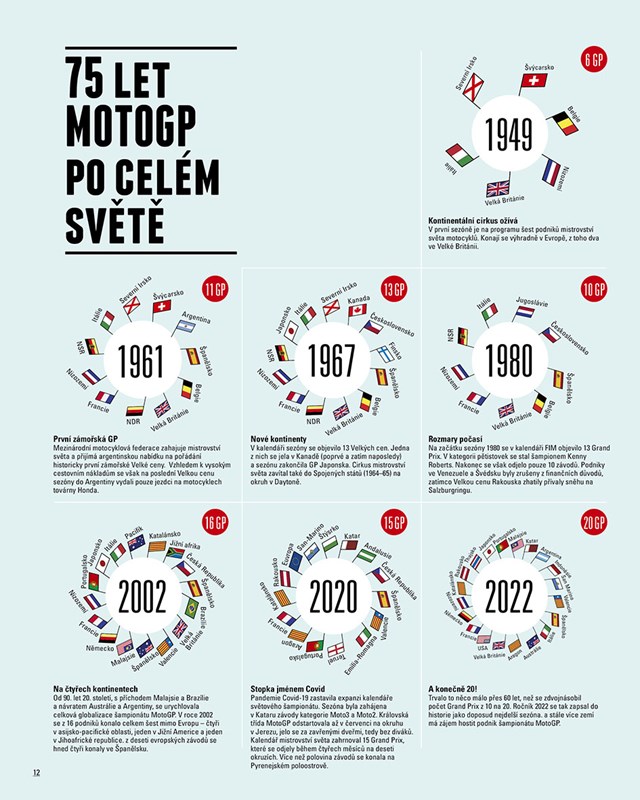 Jezdci, konstruktéři, jednotlivé historické etapy, legendární okruhy, zúčastněné země, vše je podrobně zpracováno do četných statistik doprovázených přehlednou infografikou, díky níž získáte ucelenou představu o světě Grand Prix. Nechybí také rozhovory s legendami motosportu a samozřejmě ani jedinečné fotografie – přímo z archivu Mezinárodní motocyklové federace a skvělých fotografů Stana Pereca a Lukasze Swidereka.