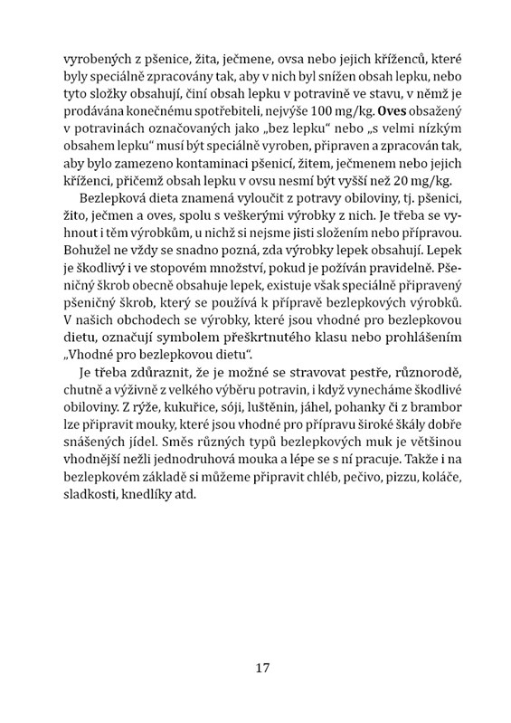 Celiakie je autoimunitní onemocnění, při kterém dochází k nepřiměřené reakci na lepek obsažený v některých obilninách a v potravinách z těchto obilnin vyrobených. Důsledkem je poškození střevní sliznice projevující se bolestmi břicha, zhoršeným přijímáním výživy, nedostatečným vstřebáváním vitaminů a některých minerálů, jež následně vede k osteoporóze a dalším komplikacím. Počet nemocných v České republice se odhaduje na 1 % populace, tedy na více než 100 000. Úvod z pera doc. Pavla Kohouta přináší základní seznámení s nemocí a upozorňuje i na potraviny, kterých by se pacient měl vyvarovat. Druhou část knihy tvoří dietní kuchařka od nutriční terapeutky Moniky Vernerová, která se zaměřuje na bezlepkovou dietu a přináší kolem 150 receptů na pečivo, polévky, knedlíky, masové pokrmy, sladká jídla a pomazánky. Jídla jsou pestrá, chutná a připravovaná z rozmanitého výběru potravin. Kniha je doplněna nutričními hodnotami.