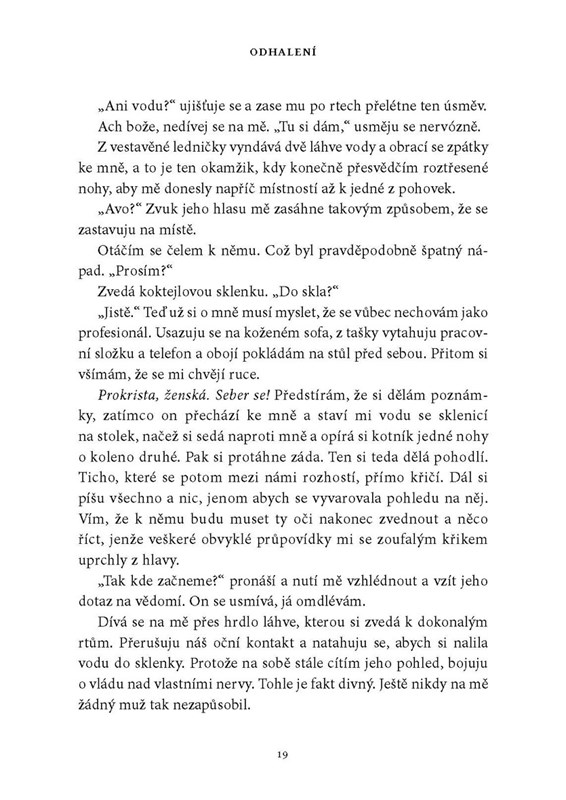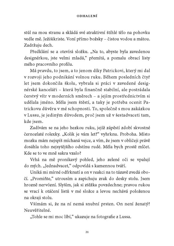 Ava O’Sheaová dostane novou zakázku na úpravu interiérů v luxusním Panském sídle. Očekává, že ji přijme postarší rezervovaný pán, ale Jesse Ward je pravý opak. Tenhle neuvěřitelně pohledný muž ji na první pohled okouzlí a ona se nechá strhnout jeho šarmem a sebejistotou. Zároveň si uvědomí, že mu nemůže podlehnout úplně, a snaží se proto alespoň částečně vymanit z jeho vlivu, jak jí velí intuice. Jenže Jesse ji nechce pustit. Posílá jí do práce bílé kaly, brání ji před bývalým milencem i před zuřivým řidičem a její spolubydlící koupí nové auto, aby už z něj Ava neměla modřiny. Ubrání se mu, nebo tomuto rozporuplnému muži podlehne? A co odhalí v Panském sídle?