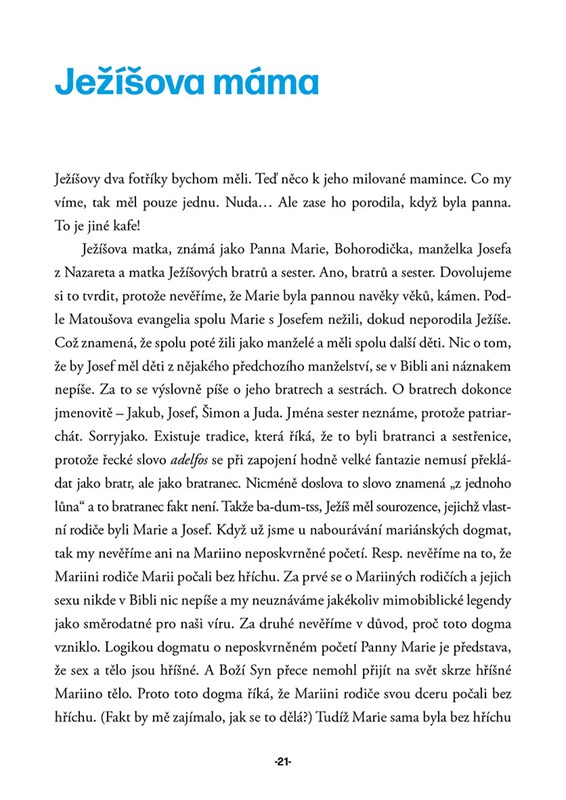 Ježíš. Jošua. Prorok. Syn Boží. Tenhle týpek je (po vodě) chodící důkaz toho, že s dobrým rodinným zázemím jdou dělat zázraky. Třeba měnit nealko ve víno, klonovat ryby nebo zahlásit tak mocně, že by to probralo i mrtvého. Jsou ale věci, které jste o něm určitě nevěděli. Jak vycházel se svými dvěma táty? Co vyváděl během teenagerovských let? A jak se satanem vytřel podlahu? To vše zjistíte ve sbírce hloubavých úvah i zábavných postřehů ze života člověka, který se stal tak slavným, že o něm udělali i muzikál.