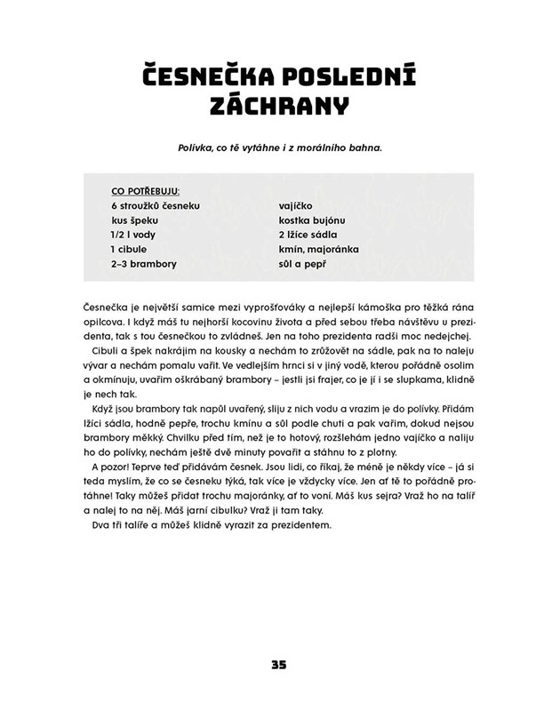 Nazdar, žrouti! Tahle kuchařka je pro všechny, co vědí, že vařit se má s půllitrem v ruce a muzikou na plný kule. Žádný dietky, žádný chia semínka – jen poctivý žrádlo, co vás postaví na nohy i po kalbě století. Najdete tu desítky mejch oblíbenejch receptů jako sýrovej výbuch, majonézovej masakr, Satanův houbovej poklad nebo legendární segedín, co rozpláče nejednoho vegana. Tak si pusťte Motörhead, otevřete pivko a pojďte do toho, protože se mnou je vaření nářez! A to vám podepíšu i na štangli salámu.