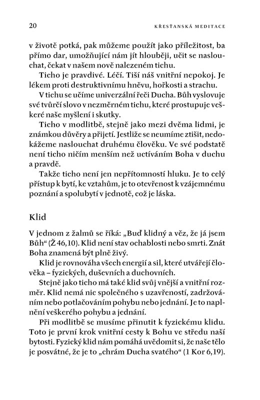 Benediktin Laurence Freeman je známým autorem řady knih o křesťanské meditaci, s níž má bohaté zkušenosti. Spolupodílel se na organizování křesťanského meditačního společenství v Montrealu, roku 1991 založil v Anglii Mezinárodní centrum světového společenství pro křesťanskou meditaci. Aktivně se podílí také na mezináboženském dialogu. V útlé knize nazvané prostě Křesťanská meditace nepodává teoretický rozbor, nýbrž praktický návod, doplněný řadou užitečných postřehů a rad, které během let nasbíral. Kniha bude užitečná každému vážnému zájemci o tuto křesťanskou praxi.