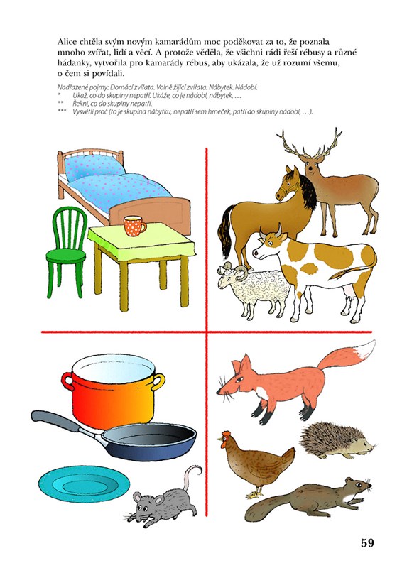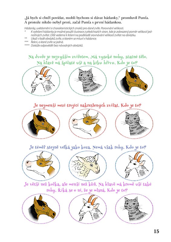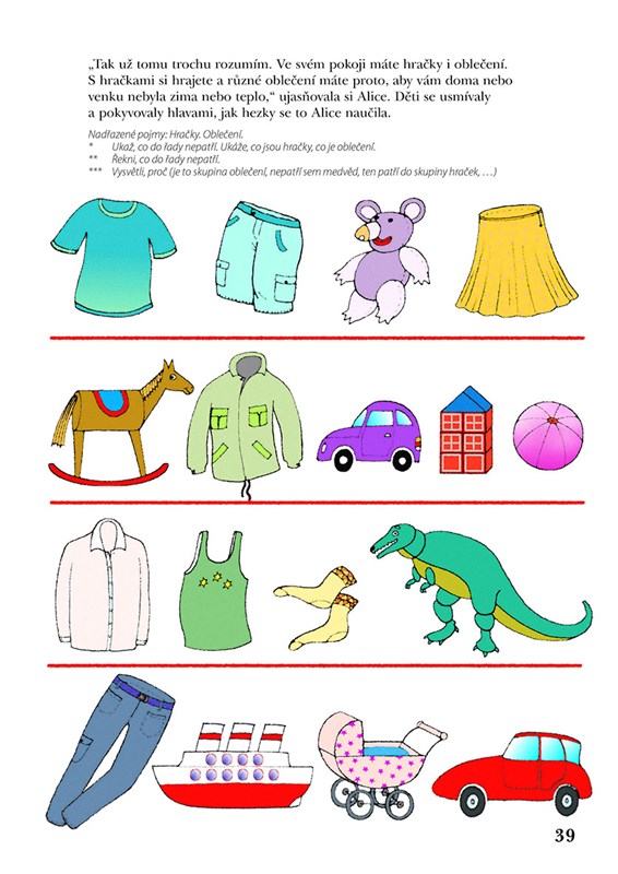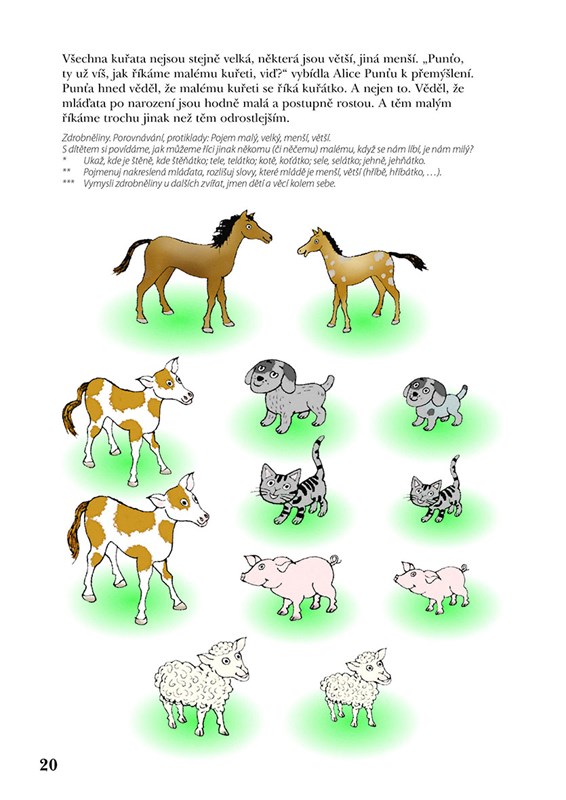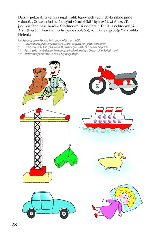 * Především systém podnětů pro rozvoj řeči a slovně logického myšlení formou povídání, her a dalších aktivit. Řazení činností kopíruje a respektuje vývojové fáze slovní zásoby a porozumění řeči od pasivní úrovně po aktivní slovník. Náročnost úkolů se stupňuje od těch pro dítě méně obtížných po obtížnější, představující vývojově vyšší roviny. Náměty jsou nabízeny tak, jak se dítě s pojmy a situacemi může setkávat. Je vytvářen prostor k propojování jednotlivých informací, přemýšlení ve vzájemných vazbách a souvislostech.