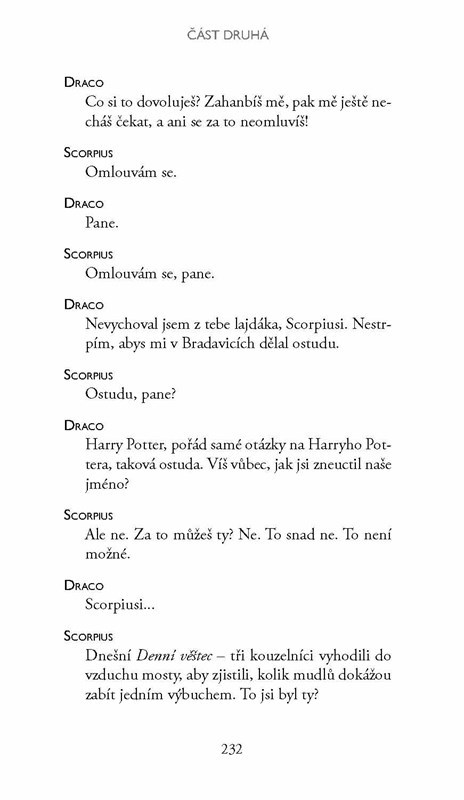 Harry Potter to nikdy neměl snadné a teď, jako otec, manžel a přepracovaný zaměstnanec Ministerstva kouzel, to má ještě těžší. Potýká se s minulostí, která nechce zůstat tam, kam patří, a jeho nejmladší syn Albus se musí prát s tíhou rodinného dědictví, o které nikdy nestál. Minulost a současnost se čím dál hrozivěji prolínají a otec i syn zjišťují nepříjemnou pravdu: temnota někdy vyvěrá z nečekaných míst.