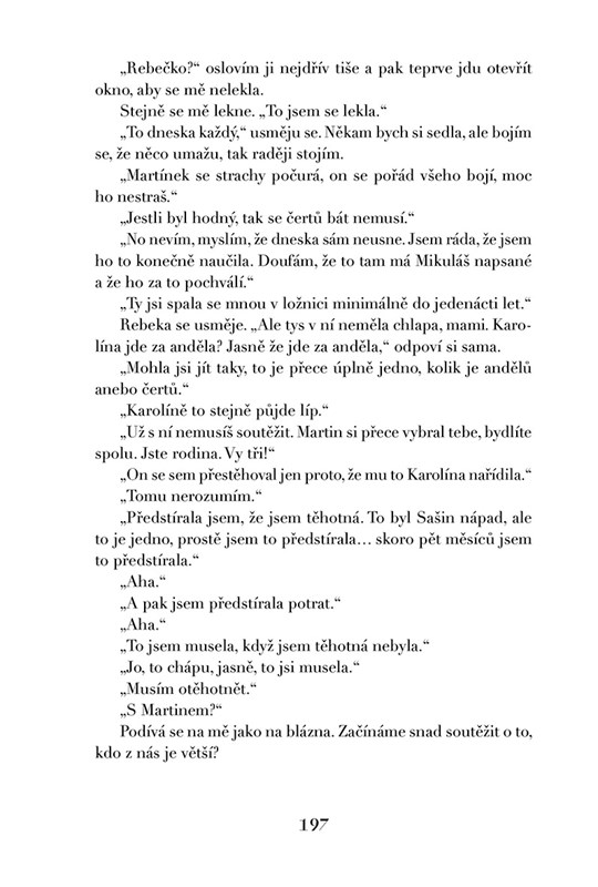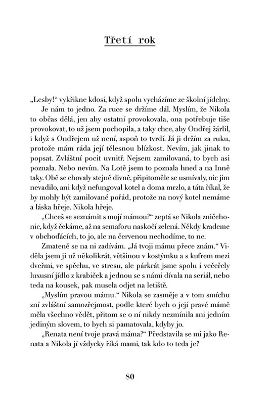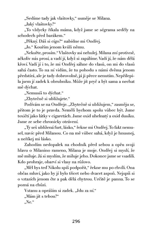 Rebeka a Karolína, těžko říct, čí je to vina. Dvě řadovky, sněhuláci, Bohnice, kolo a nezpevněná krajnice, ze které sjedeš nebo do tebe vrazí vlak, měsíce v kómatu, slzy a Milana, co potřebuje mámu, a Nikola má dvě, v termosce na čaj víno, proutěné košíky, svatby, pohřby a vraždy, Linda tvrdí, že tady něco smrdí, a Saša je v cele, to ještě není celé, ještě Magda, slinivka, provaz a kameny pro toho, kdo by byl zraněný, bolest i naděje, že se to skutečně neděje, že život je jenom demo, ze šlapky jeptiška, banány, pašeráci a obětavá Bety, rozdílné světy, co spolu skončí u poslední věty. Všeho je moc a všechno je krát. Před Bohem za Bohem nikdo nesmí stát, jinak nebudu hrát. A co ten batoh?
