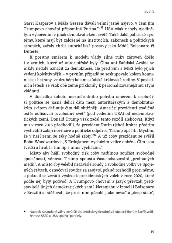 Samozvaní autoritáři – od Trumpa, Putina a Bolsonara až po Erdo?ana, Siho či Módího – se v poslední době stali jedním z nejvýraznějších rysů globální politiky. Na domácím poli se tváří jako ochránci obyčejných lidí před strašlivým vlivem globalistů, v zahraničí vystupují coby hrdé ztělesnění vlastního národa. A kamkoli přijdou, rozdmýchávají už tak dost silný kult osobnosti.