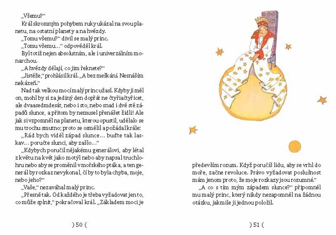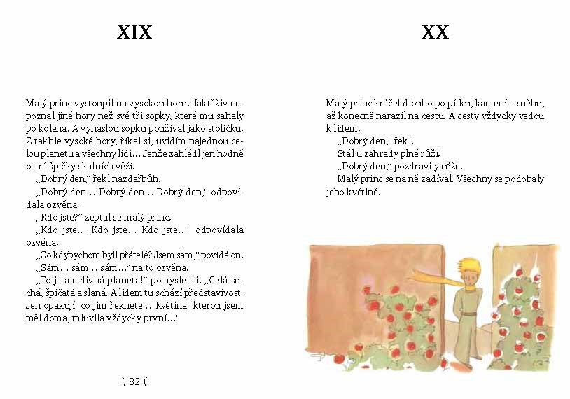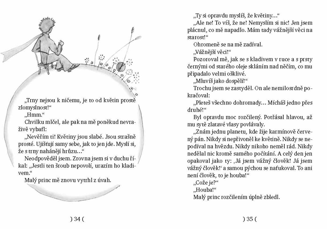 S Malým princem se v africké poušti setkává opuštěný letec, autor této knížky. Zatímco se pokouší opravit havarovaný stroj, povídají si o všeličem. O tajemství podivuhodné pouti Malého prince, o dobru a zlu, o přátelství a kráse, o pravém štěstí, o odpovědnosti za ty, které máme rádi. A vůbec nezáleží na tom, odkud pocházíme: Malý princ pocházel z tak malinké planetky, že si to možná ani neumíme představit. Ale věděl, že je třeba chránit květinu, kterou vypěstoval, a že mu to přineslo větší radost než pijákovi plná láhev, podnikateli peníze a panovačnému králi nezměrná moc. Knížka vychází s původními ilustracemi autora a v novém moderním překladu Richarda Podaného.