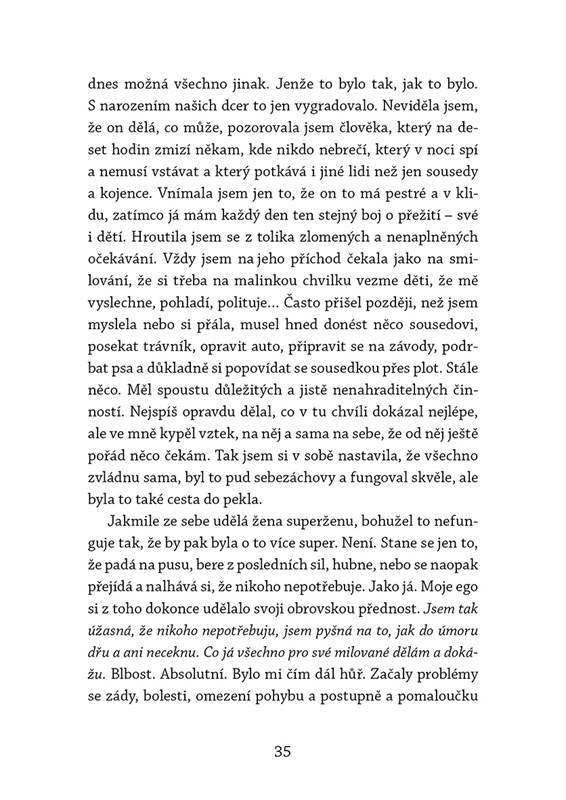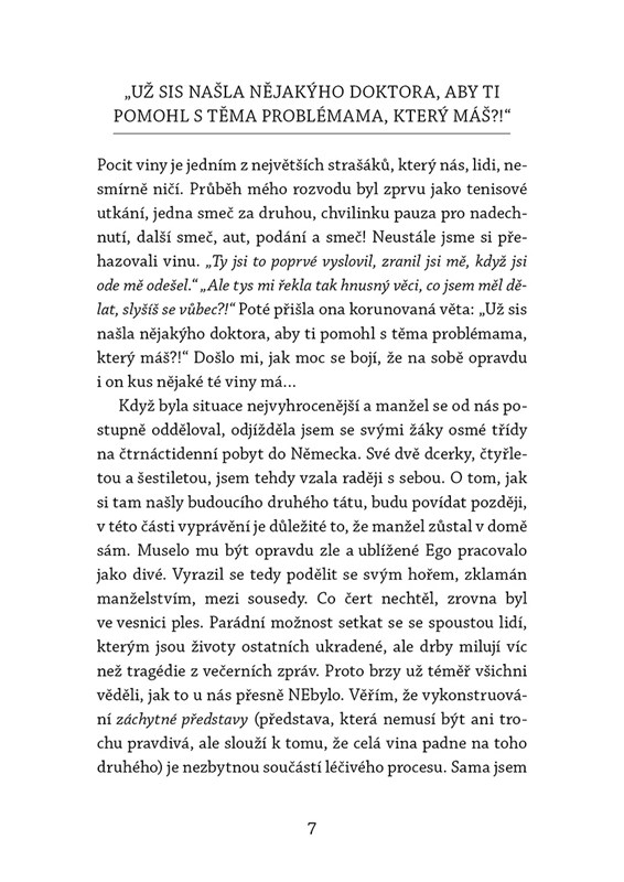 Stejně jako já. Rozvod byl jedna z nejlepších věcí, jež mě v životě potkala. Nedám na něj dopustit a vážně jsem si ho užila. Neříkám, že to nebolelo, ale skrz trnitý keř vedla cesta ke svobodě, k sebelásce, k probuzení. Moje kniha je střípek ze života ženy, mámy, učitelky a samoživitelky. Zpověď, nahlédnutí do tajemných komnat i přiznání nedokonalostí, šrámů a strachů. Příběh o přijetí výzvy. Můj příběh.