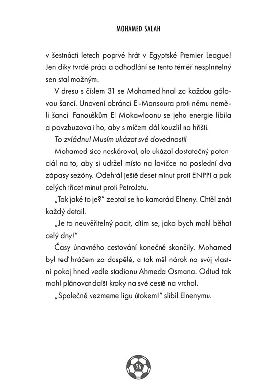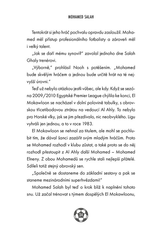 Mohamed Salah, egyptská superhvězda anglického Liverpoolu, je jedním z nejlepších hráčů současného světového fotbalu. Seznamte se s jeho životním i fotbalovým příběhem, který je inspirací pro všechny děti i mladé sportovce. Malý Mohamed miloval fotbal odjakživa a jeho snem bylo hrát za egyptskou fotbalovou reprezentaci. Z malé vesničky Nagrig se díky svému talentu, píli a odhodlání nakonec dostal až mnohem dál. Nejprve z káhirského Al Mokawloonu zamířil do Basileje, poté do Chelsea, stihl hostování v Itálii, aby pak vynikl v dresu liverpoolských Reds. V této knize naleznete podrobné vyprávění o jeho životě, kariéře i velkých fotbalových zápasech. A na konci samozřejmě nesmí chybět zábavný kvíz.