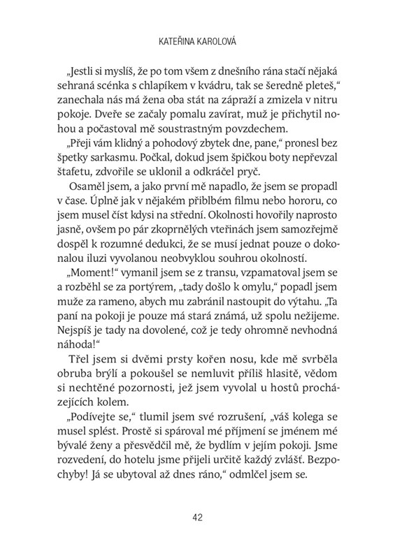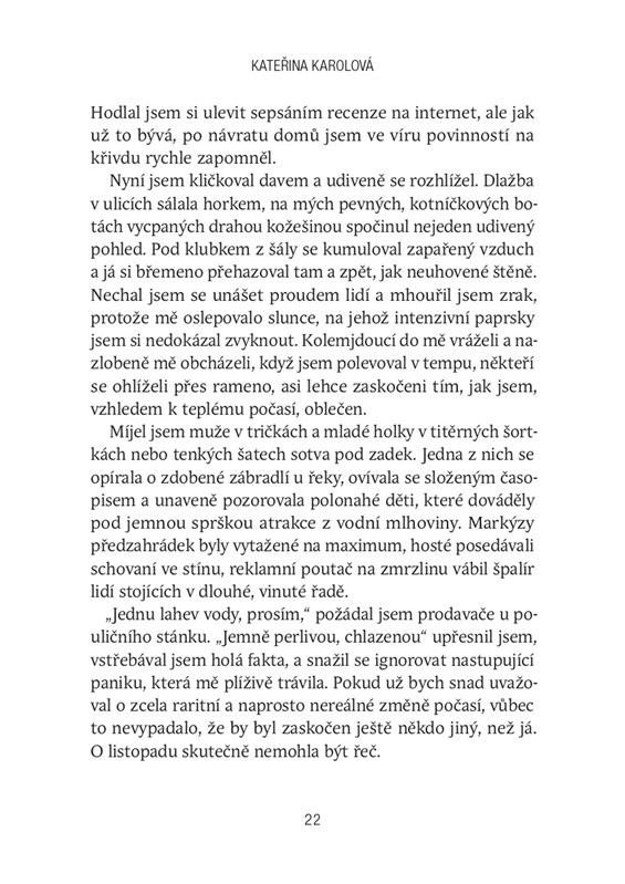 Lékař Jakub Svoboda přijíždí na odbornou konferenci do Karlových Varů. Čeká ho přednáška na jevišti, a to v rámci velmi oblíbené akce nabité poutavými příběhy z praxe. Sál je vyprodán, hlediště zaplněno, ale Jakub se na vlastní výstup příliš netěší. Nikdy si veřejná vystoupení a pozornost lidí nevychutnával, trochu se obává, že nenaplní vysoká očekávání, a rozhodne se proto zmírnit svou nervozitu před večerní prezentací krátkou procházkou po městě a jeho okolí. Má namířeno k vyhlášeným lesním vyhlídkám, místům, jež jsou vzdálená od hluku a davů turistů, jenže jen co se prosmýkne jednou z tmavých a úzkých postranních uliček, začne se v jeho životě dít něco znepokojivého. Zdá se, jako by se tu někdo zbláznil. On? Nebo jeho okolí? Co s tím, když něco naprosto jasně definovaného přestane být takové, jaké by mělo být? Máte rádi tajemství, záhady a napínavé čtení? Pak by tahle kniha neměla uniknout vaší pozornosti, protože právě s ní se Kateřina Karolová vrací v té nejlepší formě!
