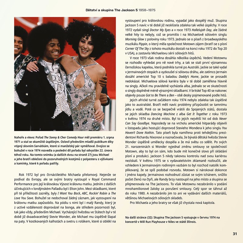 Obrazově bohatá publikace Michael Jackson: Kouzlo, šílenství, život 1958–2009 mapuje jeho život od začátků v řadách rodinné skupiny Jackson 5 přes ikonickou sólovou desku Thriller až po chystaný comeback v nultých letech 21. století.