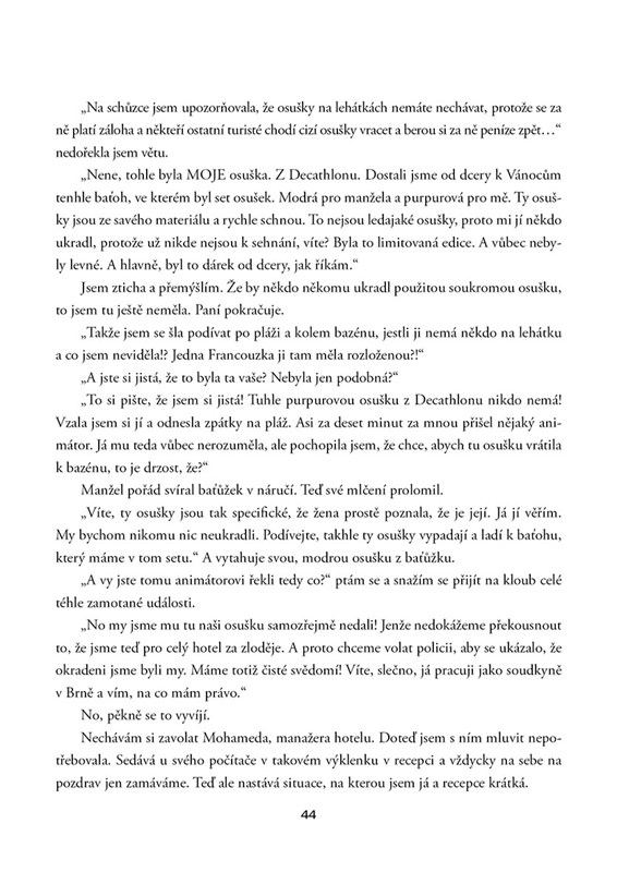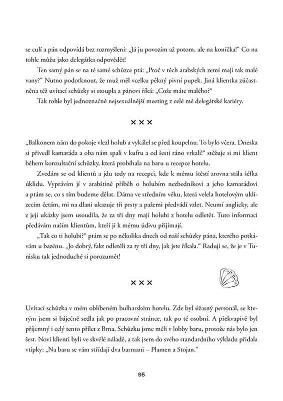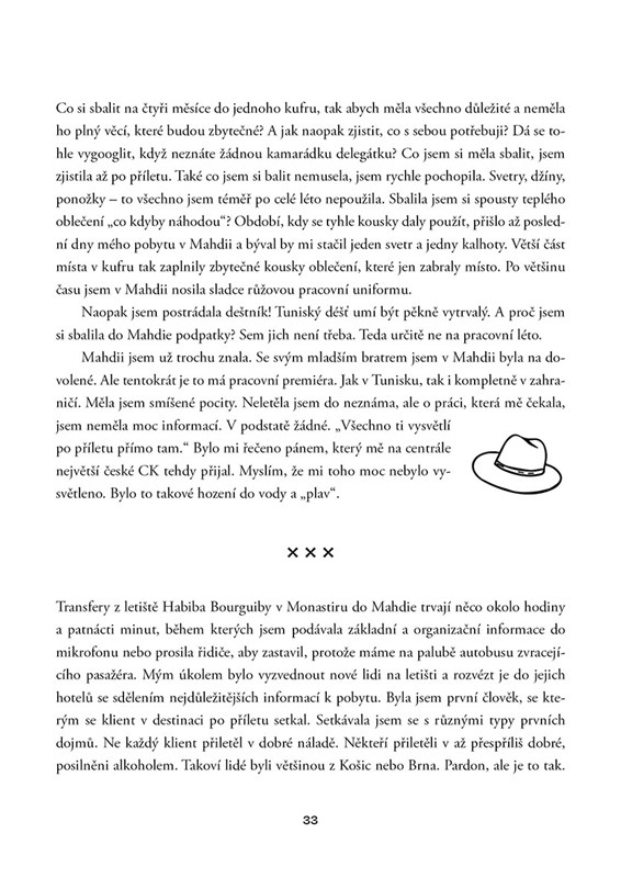Zajímalo by vás, co vše se může během zahraniční letní dovolené odehrát? Tato kniha vás zavede do zákulisí práce delegátky cestovní kanceláře. Autorka sdílí své zážitky z destinací jako Tunisko, Maroko, Bulharsko a řecký ostrov Zakynthos. Nabízí směs vtipných, vážných i absurdních situací, které zažila během sedmi letních sezon. Dozvíte se, jaké to je být delegátem a čemu všemu musí čelit. Příběhy jsou psány s nadhledem a humorem, takže se při čtení určitě zasmějete a odreagujete. Ať už máte vlastní zkušenost s delegátem, nebo jste zvědaví, jak to vypadá z druhé strany, tato kniha vám nabídne nový pohled na letní dovolenou s cestovní kanceláří.