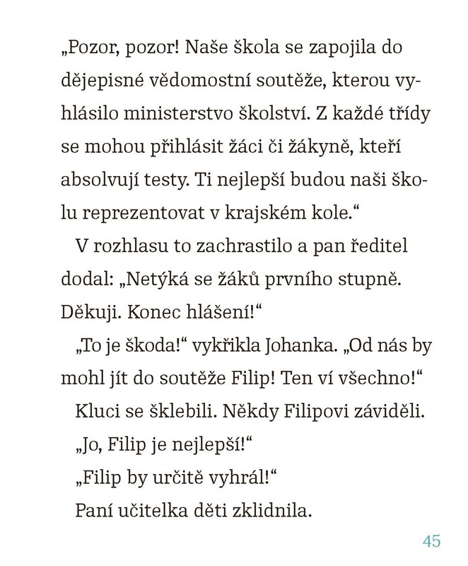 Kuba miluje sport, zato jeho spolužák Filip odmalička zbožňuje knihy. V tělocviku je ovšem naprostý břídil, neumí ani kotrmelec. Když je pak ve škole vyhlášena dějepisná olympiáda, rozhodne se přihlásit. Vždyť z oblíbené historie toho tolik zná. Jenže soutěž je pouze pro vyšší ročníky. Co teď? Ale Filip ví, jak na to!