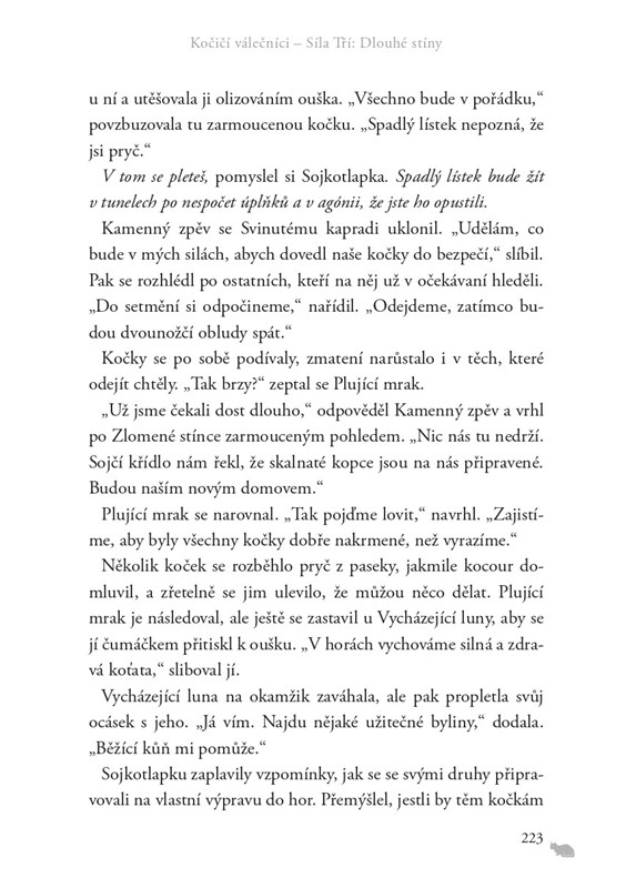 Zatímco lesními kočkami zmítají pochybnosti, Sojkotlapka, Cesmínolístka a Lví plamen jsou odhodláni přesvědčit všechny, že Hvězdný klan je pro válečnický zákoník stále životně důležitý. Ale temnota číhá na těch nejnečekanějších místech a jedna kočka se chystá odhalit tajemství, které otřese Hromovým klanem až do morku kostí. Zdá se, že ty nejtemnější stíny si každá kočka nosí v sobě.