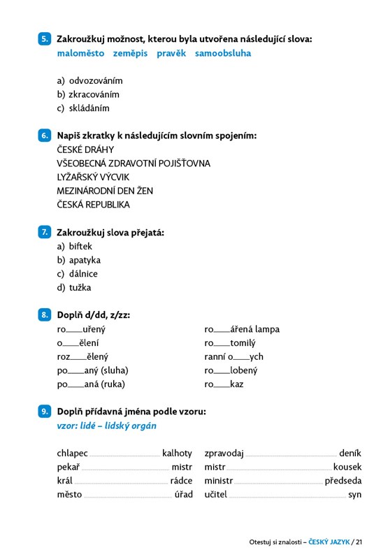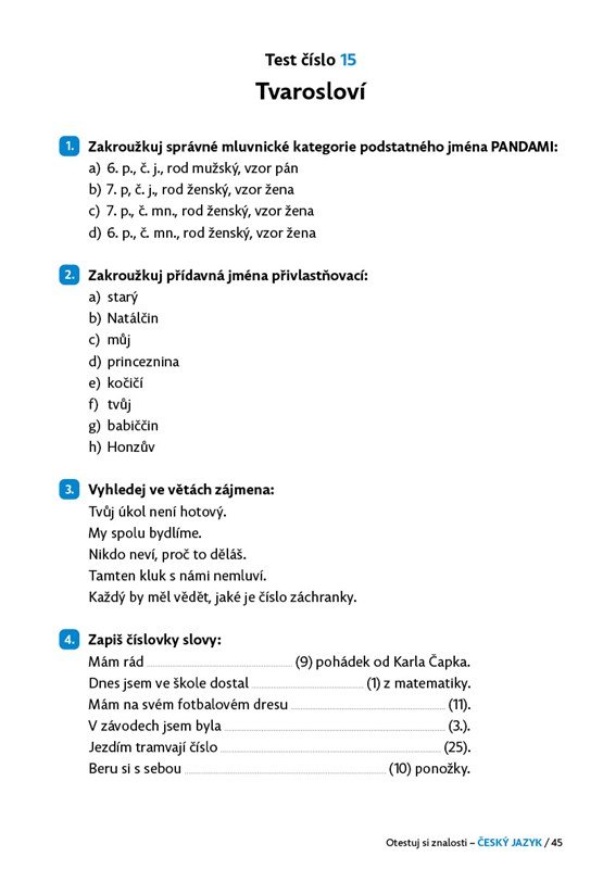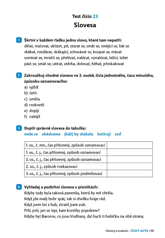 Testové úlohy z učiva českého jazyka jsou připraveny tak, aby pokryly všechna témata, o kterých se v 5. třídě učíte. Vyhodnocení testů najdete v klíči na konci knihy.