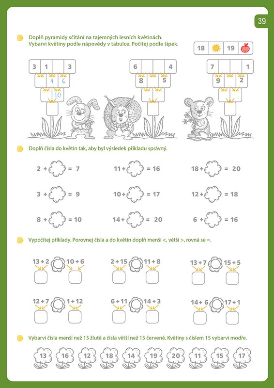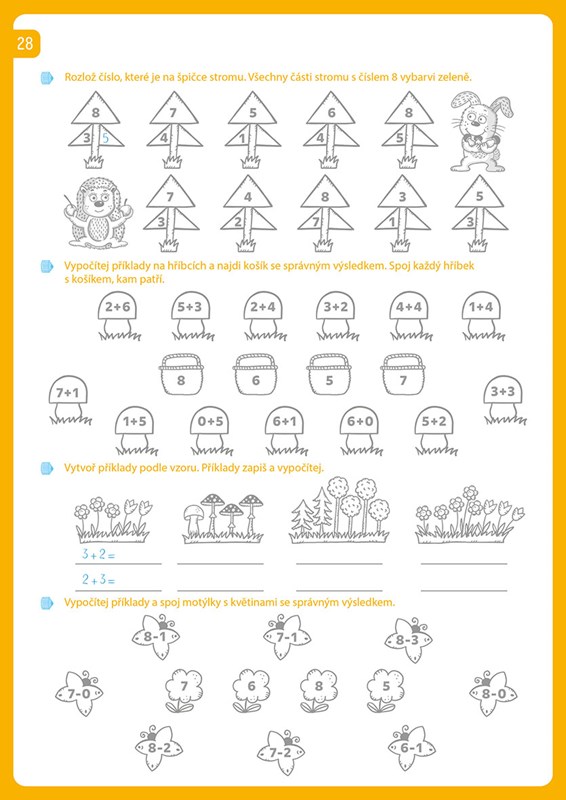 Nejen to! Najdeš tu také spoustu krásných obrázků k vybarvování, které ti zpříjemní každou stránku. Připrav si tužku a pastelky a pusť se spolu s lesními kamarády do zábavného dobrodružství s počítáním.