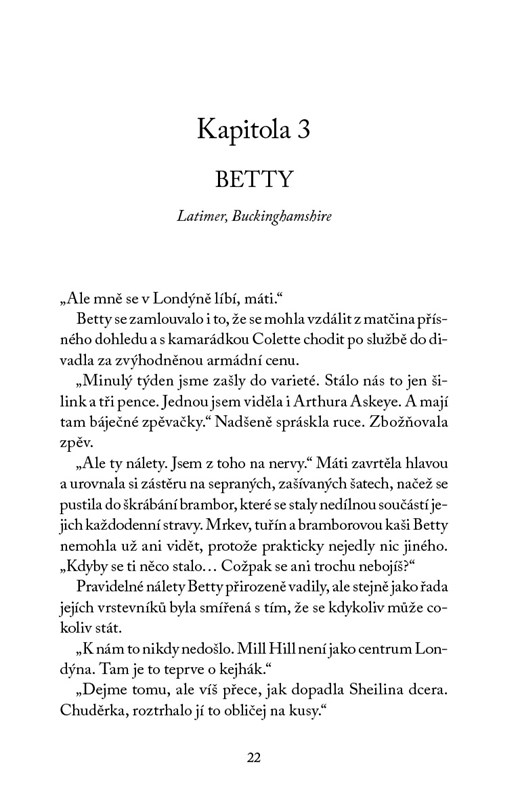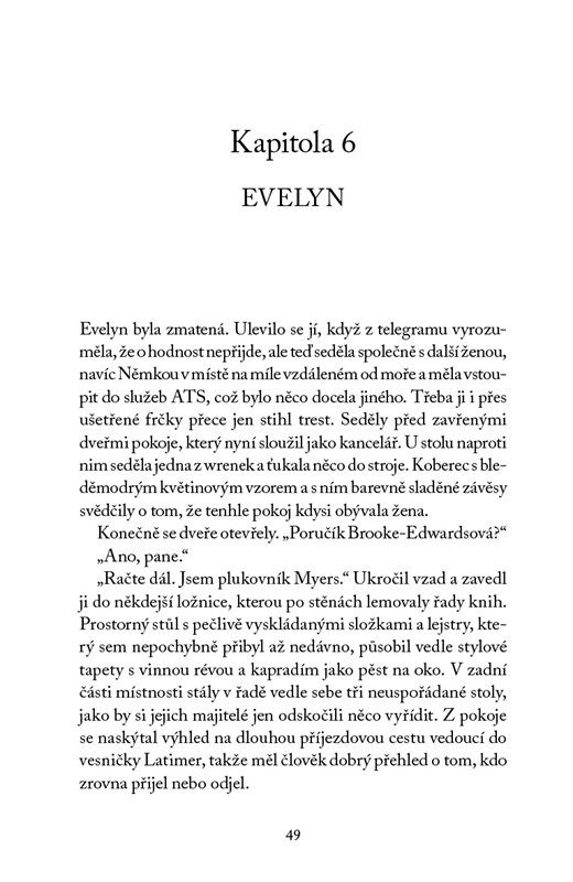 Co skrývají zdi sídla na anglickém venkově? Evelyn by dala přednost společenským sešlostem, Betty by potřebovala na farmě dohlédnout na matku se sestrou a Judith by nejraději vůbec neopustila Německo. Třem ženám však plány naruší druhá světová válka, která je svede na místo, kde mohou přispět k míru. V Latimeru jde o budoucnost celé Evropy a soukromé strasti musí jít stranou. I v době plné strachu je ovšem možné prožít lásku. A tu je potřeba střežit stejně jako válečné tajemství. Ke vzájemnému okouzlení totiž může dojít i na tom nejméně pravděpodobném místě.