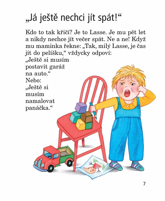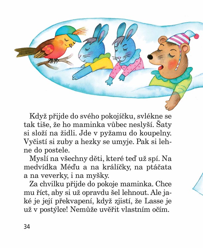 Je to s Lassem trápení! Je mu už pět let, ale každý večer zlobí maminku: „Já ještě nechci jít spát!“ Jednou se Lasse zdrží na návštěvě u tety Lotty až do tmy, a ona mu půjčí podivuhodné brýle. Těmi je vidět daleko do mnoha zvířecích pelíšků. A Lasse se dívá, jak se k spánku ukládají ptáčata, králíčci, veverky, myšák i medvědí kluk. Jestlipak také povykují, pořádají polštářové války, či se loudají do postýlek? Co myslíte?