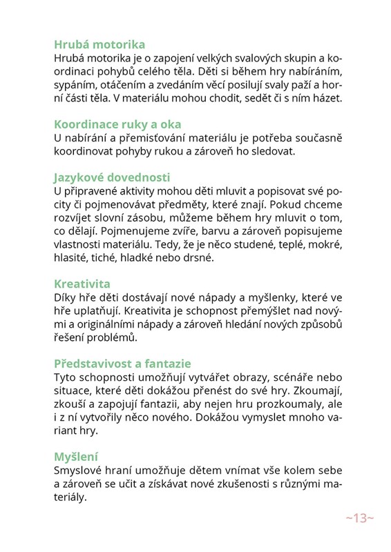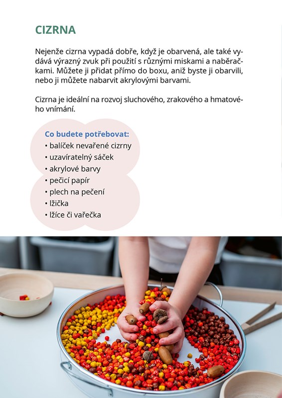 V knize se dozvíte, co smyslové hraní je a co vše přináší. Zjistíte, že smyslové hraní můžete dětem nabízet z toho, co máte už teď doma. Najdete v ní jednoduché návody a tipy na přípravu smyslových materiálů a aktivit pro děti. Kniha je doplněna fotografiemi, díky kterým budete vědět, jak má takový materiál vypadat. Můžete se inspirovat pomůckami a zjistíte, že naprosto obyčejně vypadající aktivita vaše dítě zabaví na velmi dlouho.