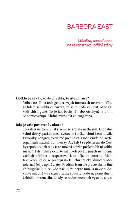Silné, inspirativní a odhodlané. Oštěpařka Nikola Ogrodníková, šéfkuchařka Eliška Hromková, scénáristka a producentka Lenka Szántó, odbornice na vězeňství Gabriela Slováková, lékařka Barbora East, válečná zpravodajka Darja Stomatová, podnikatelka Zdeňka Heyn Edlová nebo politička a diplomatka Magda Vášáryová mluví o překonávání překážek, profesní vášni i pochybnostech. Jejich příběhy, které dokazují, že ženy obstojí v jakémkoli prostředí, doplňují portréty od oceňované fotografky Jany Mensatorové.