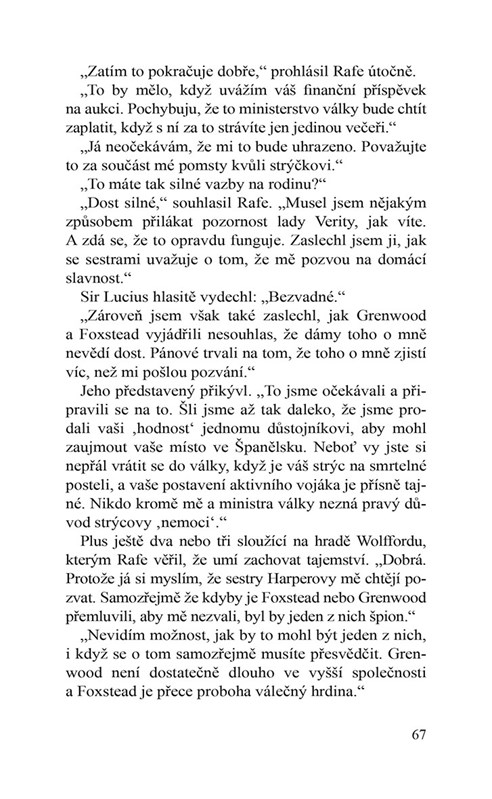 Jako dědic Vikomta je Rafe Wolfford povinen si jednou vzít ženu. Musí to však být ta správná žena – ne příliš nezávislá a poddajná. Přímočará lady Verity je zcela nevhodnou volbou. Rafeovy námluvy jsou však pouhou lstí, která má odhalit, zda Verity nebo někdo jiný spojený s Elegantními příležitostmi nevynáší Francouzům důležité informace.
