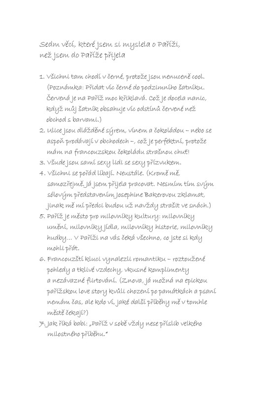 Whitney se připravila na svůj dokonalý semestr ve Francii. Napsala si ten nejlepší itinerář a seznam věcí, které musí za svůj pobyt stihnout. Věří, že ji čeká velké dobrodružství plné vintage butiků, čokoládoven a francouzské romantiky. Ale už první den na lyceu nejde všechno úplně podle toho, jak si Whitney vysnila. Bojuje se školou, stýská se jí po domově a má problémy s francouzštinou. Naštěstí je ale zvyklá bojovat, neztrácet optimismus a nevzdávat se. A pak tu je její učitel francouzštiny Thierry Magnon – odtažitý, ale pohledný fotbalista, jehož lekce francouzštiny ji možná naučí i něco jiného...