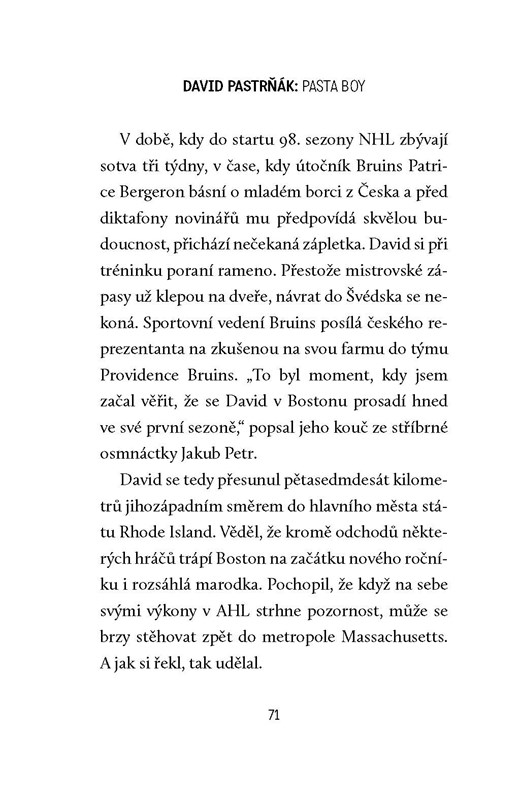 Zní to odvážně, ale český sport momentálně nemá větší hvězdu, než je David Pastrňák. Český hokej určitě ne. Vydělává moře peněz, libuje si v extravagantní módě, fanoušci slavného klubu Boston Bruins jej zbožňují. Rodák z Havířova však nezapomíná na velice skromné poměry, z nichž pochází. Vědom si jich je i renomovaný sportovní novinář Roman Smutný. Nejvíc prostoru ale dostala detailní analýza Pastrňákovy dosavadní kariéry. Od jeho začátků v nižších českých ligách přes dobytí NHL až po zlaté mistrovství světa v Praze.
