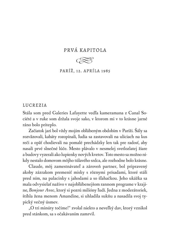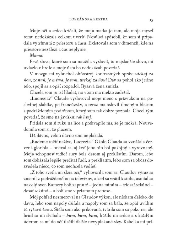 Kráča po teplých terakotových dlaždiciach rodinného domu, vo vzduchu sa vznáša vôňa ruží a čerstvého rozmarínu a Lucrezia prvýkrát po rokoch pocíti pokoj. Vie však, že ak sa tu chce opäť cítiť ako doma, musí svojim sestrám povedať zdrvujúcu pravdu o tom, prečo odišla...