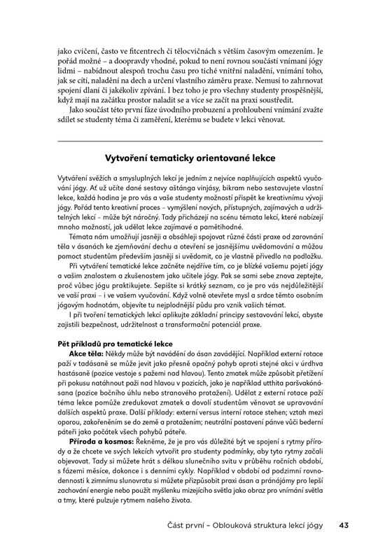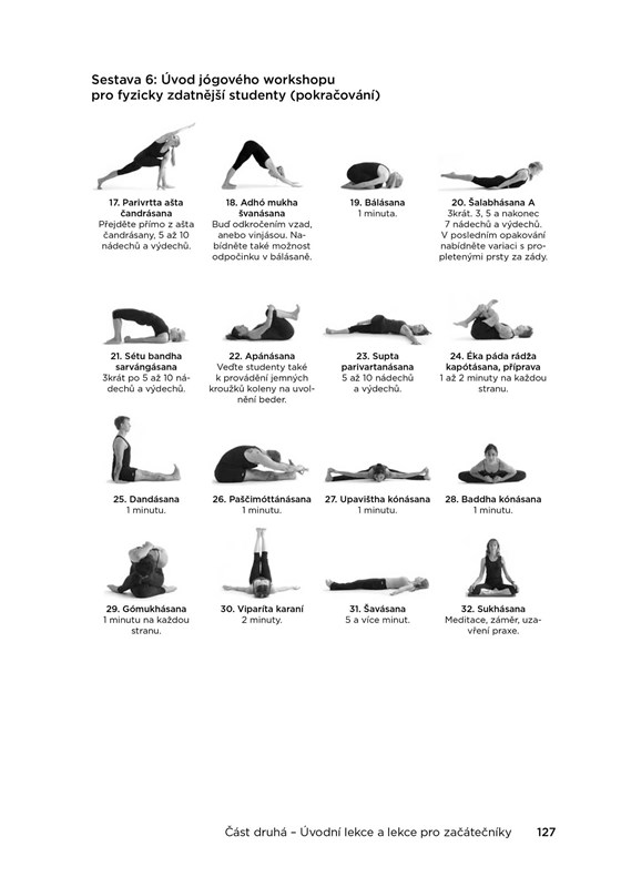 Tento kompletní průvodce plánováním a sestavováním úspěšných lekcí jógy obsahuje více než 2000 fotografií a 67 modelových jógových sestav pro široké rozpětí cvičících - pro začátečníky, středně pokročilé i pokročilé studenty; pro děti, mladistvé, ženy v různých obdobích života a pro seniory; lekce pro úlevu od deprese a úzkosti, sestavy pro každou z hlavních čaker a ájurvédských konstitučních typů.