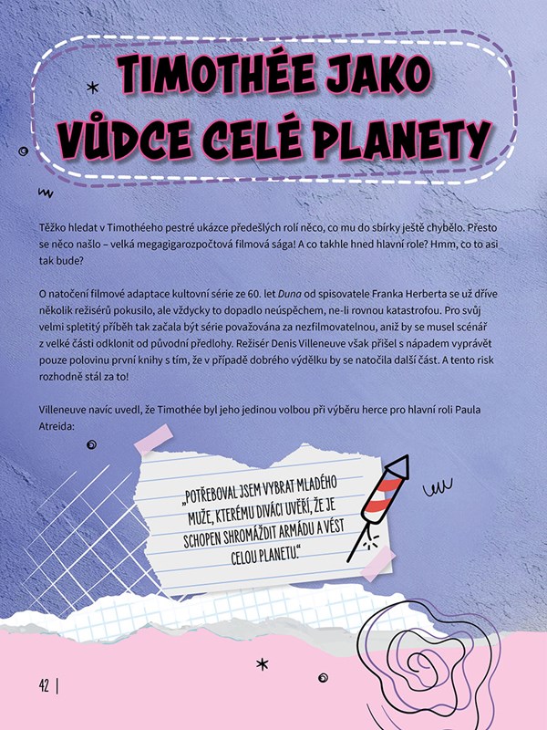 Objev životní příběh jedné z největších současných hvězd filmového plátna, seznam se s Timothéem Chalametem a zjisti o něm všechno. Jak se tento charismatický herec připravuje na své nezapomenutelné role? S kým rád tráví volné chvíle a jaký má vztah s rodinou? Dozvíš se, jaké zvíře mu přirostlo k srdci, jaké tajemství odhalil o svém osobním životě a že ho fanoušci milují i pro jeho odvážné a extravagantní outfity, které nosí s přirozeným šarmem. Přestože je Timothée Chalamet globální superstar, zůstává skromný a pevně stojí nohama na zemi. Tato kniha s mnoha celostránkovými fotografiemi je nezbytným průvodcem pro každého, kdo chce poznat tohoto jedinečného herce zblízka.