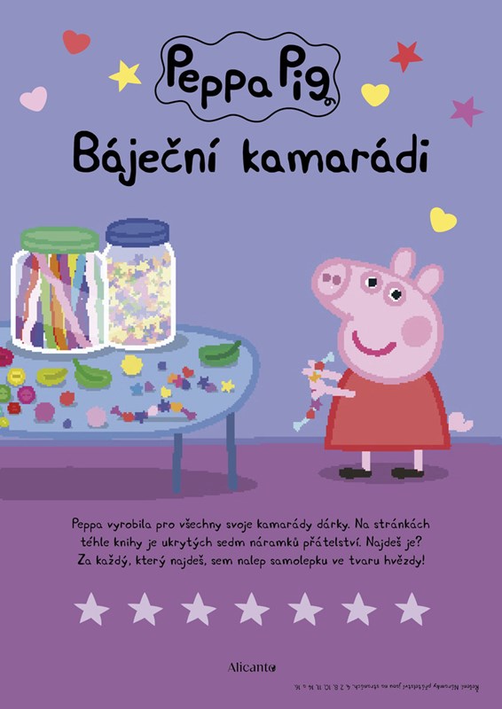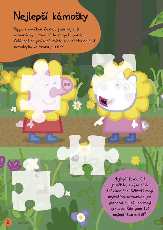 Peppa má moc ráda své kamarády. Pojďte se mezi ně podívat a společně si zahrajte hry, vyřešte hádanky, vybarvěte obrázky a vše vyzdobte krásnými samolepkami!