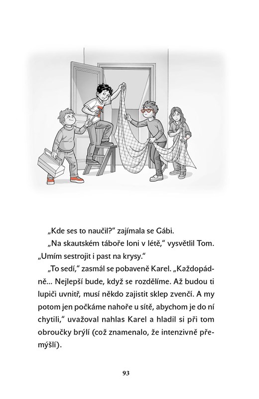 TKKG – to je Tom, Karel, Knedlík a Gábi. Čtyři kamarádi statečně řeší každý případ a vydávají se vstříc vzrušujícím dobrodružstvím. A samozřejmě nesmí chybět pes Oskar! TKKG jsou na stopě gangu zlodějů, kteří se potulují po vilové čtvrti a do domů se dostávají sklepními okny. Vykradou podvodníci také Sauerlichovu vilu? Když Knedlíkovi rodiče odejdou na večeři, TKKG využijí příležitosti a uspořádají tajnou přespávačku. Teď už jim zbývá jen čekat…