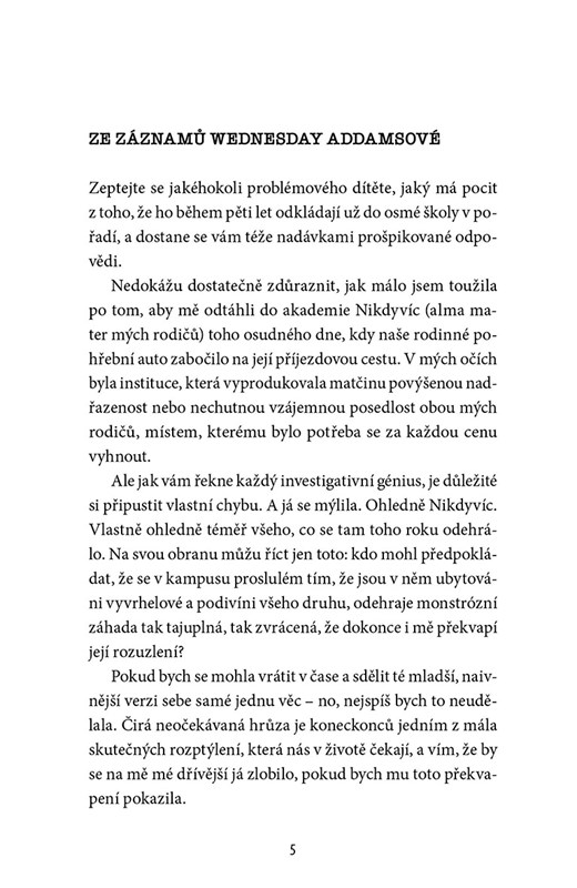 Wednesday Addamsová, nová studentka akademie Nikdyvíc, se pokouší ovládnout svoje počínající jasnovidecké schopnosti, zarazit příšerné vraždění, které ohrožuje celé město, a vyřešit záhadu, do které byli před pětadvaceti lety zataženi její rodiče. A mezitím se musí poprat s nově navázanými, velmi zašmodrchanými vztahy.