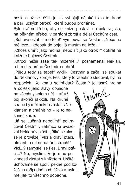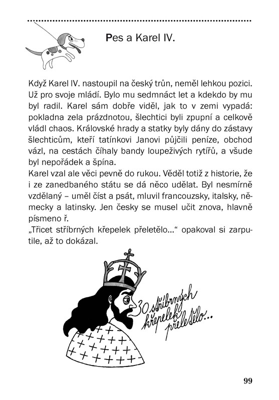 Máte rádi dějepis, zajímá vás, co se u nás v běhu času přihodilo? A chcete se o tom dozvědět trochu jinak? Pak sáhněte po knížce České dějiny očima Psa. Pes žil totiž s lidmi odjakživa, doprovázel rytíře i sedláky, procházel dějinami. Se zaujetím sledoval českou historii od praotce Čecha přes Přemyslovce, Lucemburky až k Janu Husovi. Někdy do dění přímo zasahoval, někdy ho pouze trefně komentoval. Vtipný a originální průvodce naší historií vám osvěží to, co už znáte a třeba jste trochu pozapomněli, a prozradí to, co vám zatím zůstalo utajeno. S psím kamarádem je to přece jen větší zábava!